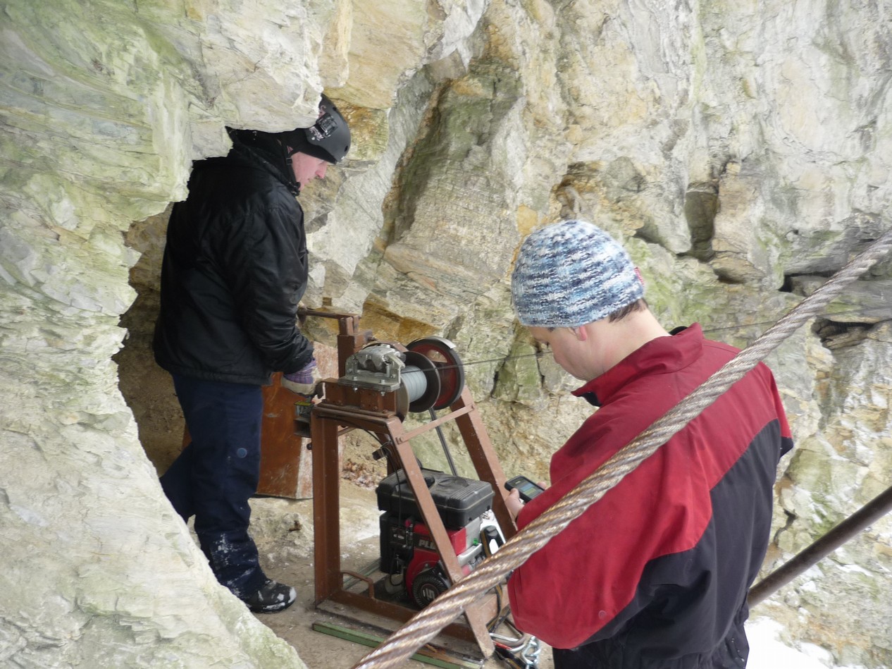 U kraje propasti se sešla nakonec poměrně početná partička lidí, ale jen málokdo mohl jít přímo do vody. Začal náročný transport od kraje propasti po schodech k vrátku. Těžkého vybavení bylo požehnaně a strmé zasněžené schody se stávaly čím dál víc kluzkými. Během přípravy výstroje Aleš nejprve zjistil, že si doma zapomněl hlavní světlo a při přípravě rebreatheru zjistil zapomenutý battery pack. To už byl rozhodnutý, že do vody nejde, protože to už bylo moc chyb najednou a nenechal se ani přemluvit ode mě, když jsem mu nabízel „svoji“ jednotku, aby do vody mohl jít on.